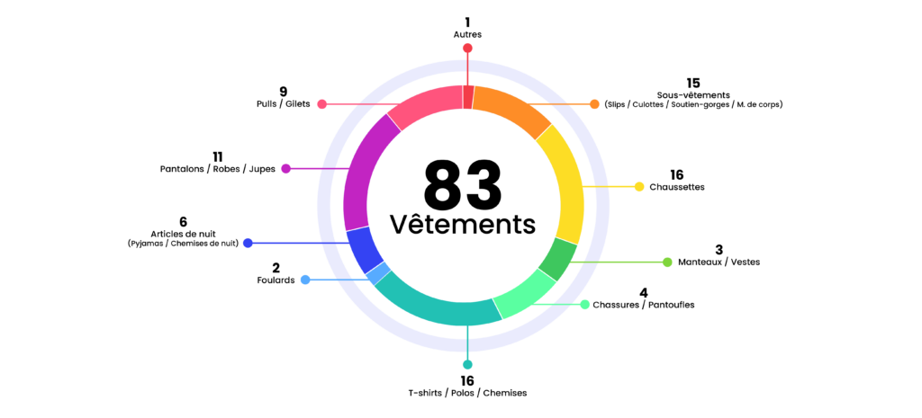 Chez Ubiquid, nous avons donc décidé de vous présenter la liste moyenne des articles constatés pour l’ensemble de nos clients. Cette liste ne cherche pas à être exhaustive, mais à vous donner une idée de la répartition type des vêtements, pour plus de 50 000 résidents en EHPAD. Nous vous offrons ici une infographie de ce trousseau, ainsi qu’une page de checklist à imprimer pour vous aider à vous organiser.